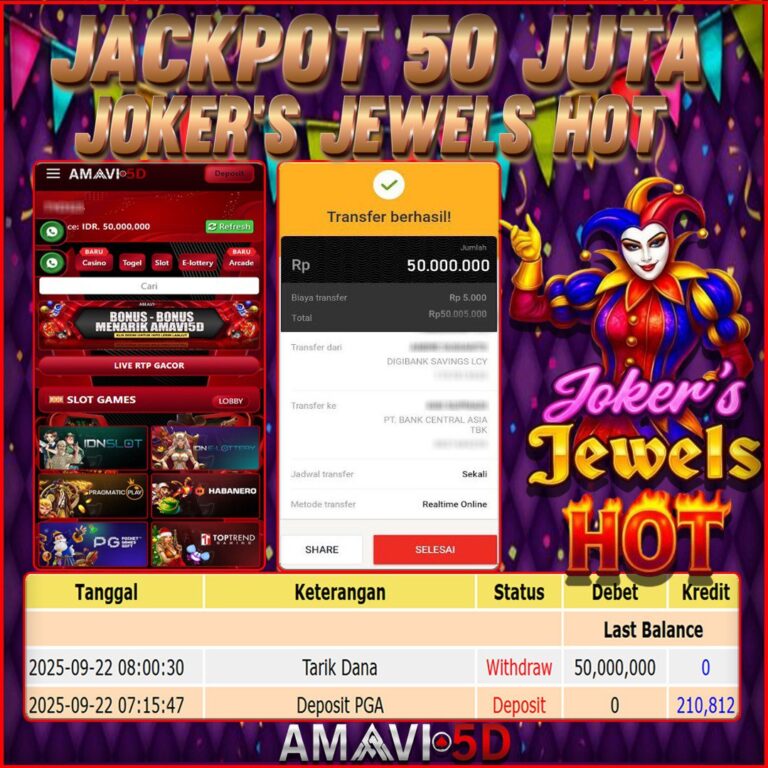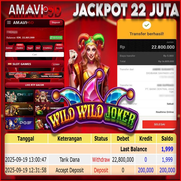 AMAVI5D JACKPOT SLOT WILD WILD JOKER Rp.22.800.000,- LUNAS JUMAT, 19 SEPTEMBER 2025 Selamat kepada User id : bos**44 Telah berhasil mendapatkan kemenangan besar pada permainan SLOT WILD WILD JOKER kemenangan Sebesar Rp.22.800.000, Setelah mengisi formulir withdraw dengan kurung waktu hanya 5 – 10 menit pihak amavi5d sudah melakukan transfer kepada pemilik User id dan dana…