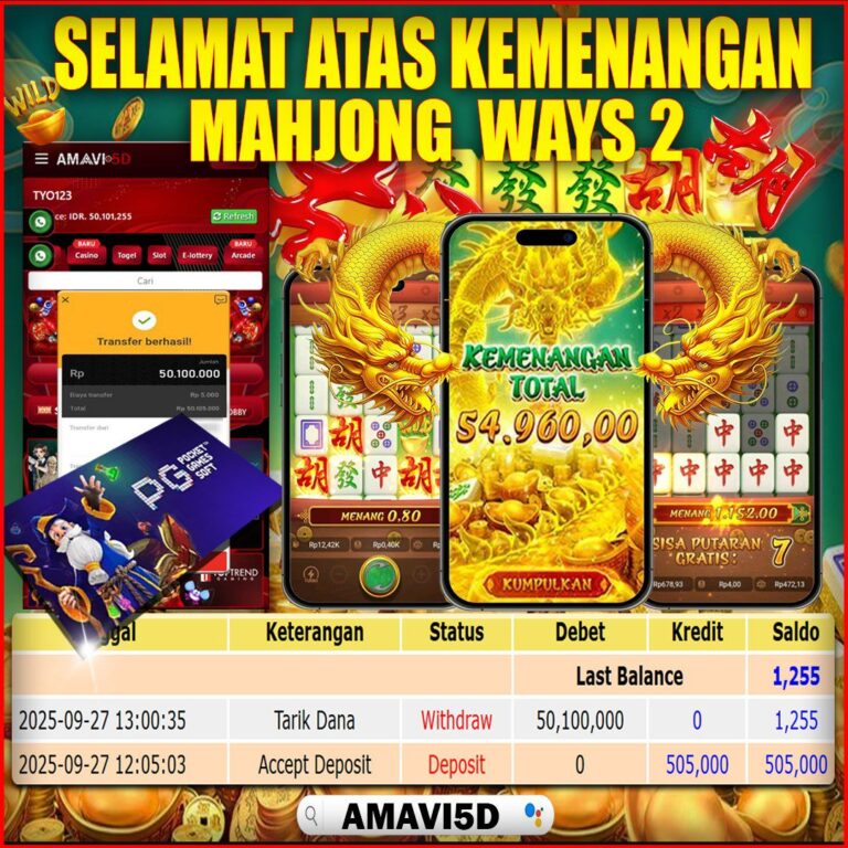 AMAVI5D JACKPOT SLOT MAHJONG WAYS Rp 19.000.000,- LUNAS, MINGGU, 02 NOVEMBER 2025Selamat kepada User id :ser***541Telah berhasil mendapatkan kemenangan besar pada permainanSLOT MAHJONG WAYS kemenangan Sebesar Rp19.000.000, Setelah mengisi formulir withdraw dengan kurung waktu hanya 5 – 10 menit pihak amavi5d sudah melakukan transfer kepada pemilik User id dan dana sudah dapat di cairkan oleh…