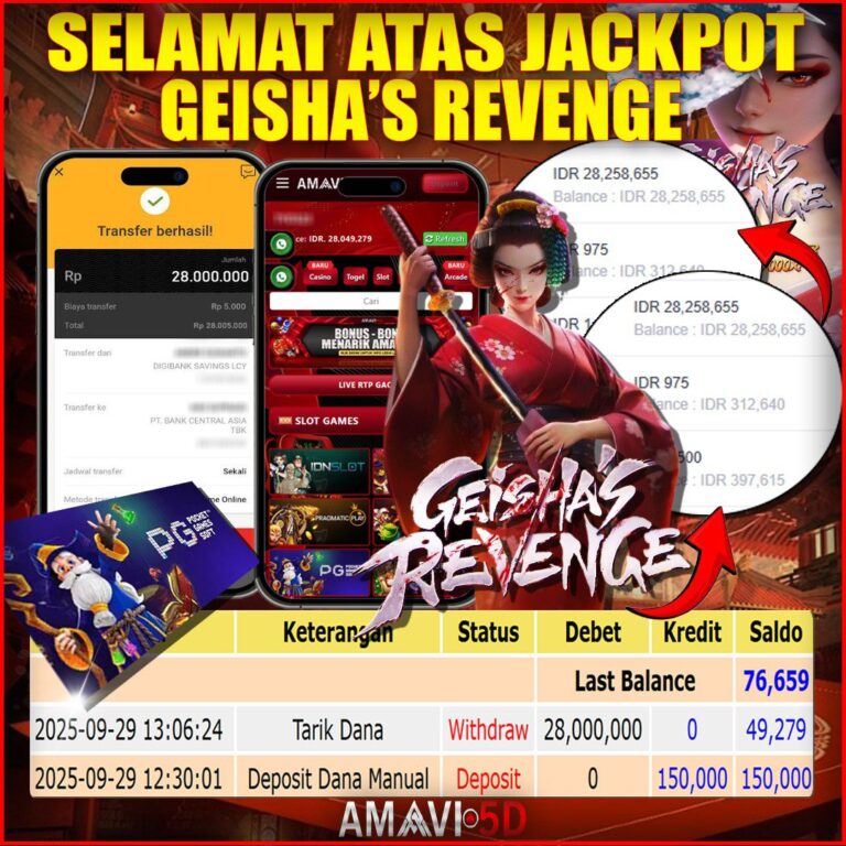 AMAVI5D JACKPOT SLOT GEISHA’S REVENGE Rp.11.000.000,- LUNAS MINGGU, 14 SEPTEMBER 2025 Selamat kepada User id : mpi**22 Telah berhasil mendapatkan kemenangan besar pada permainan SLOT GEISHA’S REVENGE kemenangan Sebesar Rp.11.000.000, Setelah mengisi formulir withdraw dengan kurung waktu hanya 5 – 10 menit pihak amavi5d sudah melakukan transfer kepada pemilik User id dan dana sudah dapat…