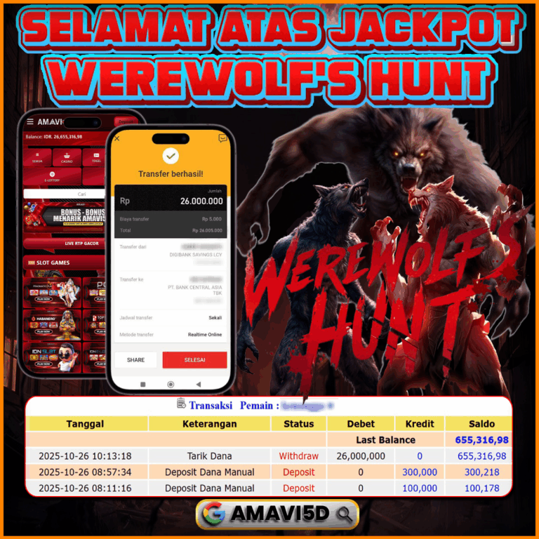 AMAVI5D JACKPOT SLOT WEREWOLFS HUNT Rp 26.000.000,- LUNAS, MINGGU , 26 OKTOBER 2025Selamat kepada User id : TGR****58 Telah berhasil mendapatkan kemenangan besar pada permainanSLOT WEREWOLFS HUNT kemenangan Sebesar Rp26.000.000, Setelah mengisi formulir withdraw dengan kurung waktu hanya 5 – 10 menit pihak amavi5d sudah melakukan transfer kepada pemilik User id dan dana sudah dapat…