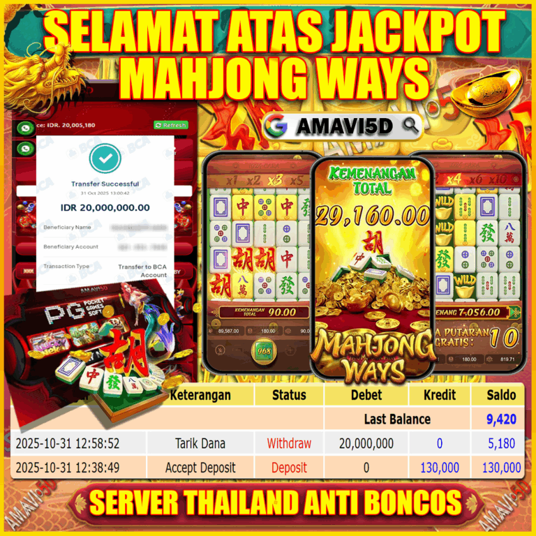 AMAVI5D JACKPOT SLOT MAHJONG WAYS Rp 20.000.000,- LUNAS, JUMAT, 31 OKTOBER 2025Selamat kepada User id :yikw***93Telah berhasil mendapatkan kemenangan besar pada permainanSLOT MAHJONG WAYS kemenangan Sebesar Rp20.000.000, Setelah mengisi formulir withdraw dengan kurung waktu hanya 5 – 10 menit pihak amavi5d sudah melakukan transfer kepada pemilik User id dan dana sudah dapat di cairkan oleh…