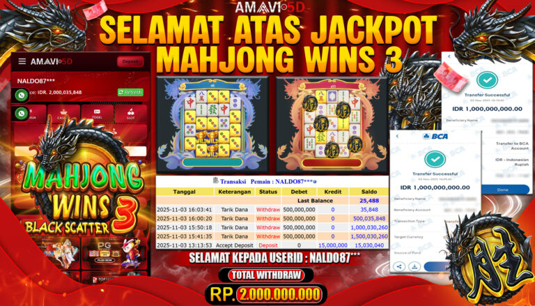 AMAVI5D JACKPOT SLOT Mahjong Wins 3 – Black Scatter Rp 2,000,000,000,- LUNAS, SENIN, 03 NOVEMBER 2025Selamat kepada User id : NALDO87***Telah berhasil mendapatkan kemenangan besar pada permainanSLOT Mahjong Wins 3 – Black Scatter kemenangan Sebesar Rp2.000.0000,000 Setelah mengisi formulir withdraw dengan kurung waktu hanya 5 – 10 menit pihak amavi5d sudah melakukan transfer kepada pemilik…