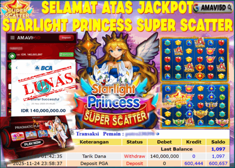 AMAVI5D SLOT STARLIGHT PRINCESS SUPER SCATTER Rp 140.000.000,– LUNAS,SELASA ,25 NOVEMBER 2025 Selamat kepada User id : Bag***25 Telah berhasil mendapatkan kemenangan besar pada permainanSLOT STARLIGHT PRINCESS SUPER SCATTER kemenangan Sebesar Rp140.000.000, Setelah mengisi formulir withdraw dengan kurung waktu hanya 5 – 10 menit pihak amavi5d sudah melakukan transfer kepada pemilik User id dan dana…