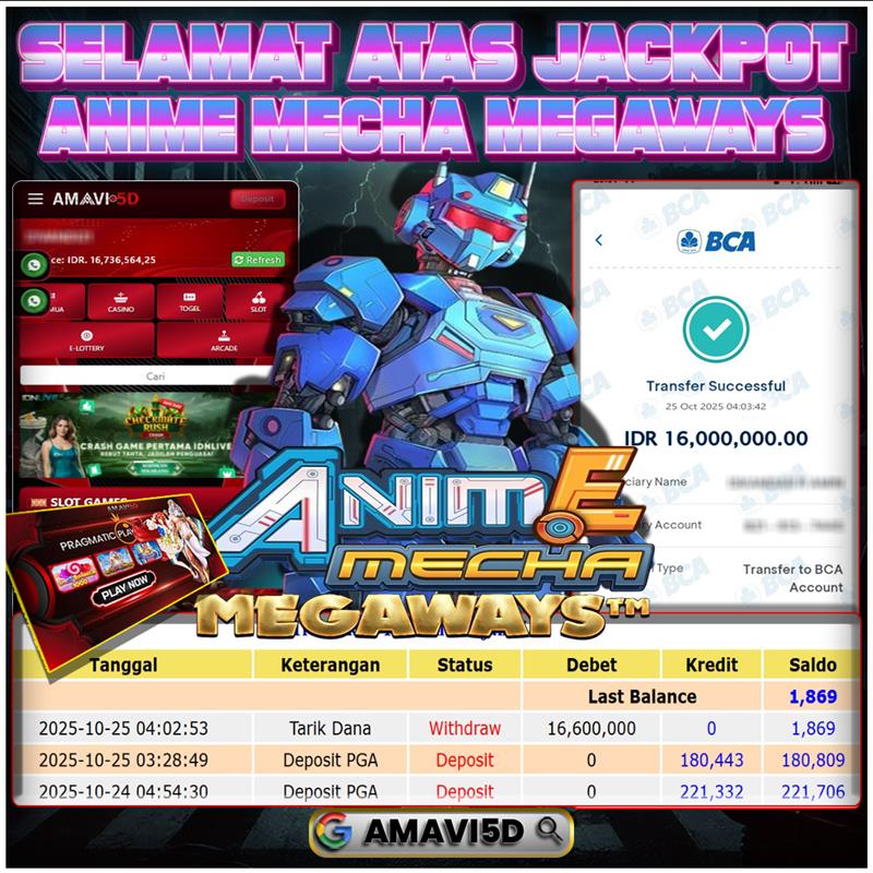 SLOT ANIME MECHA MEGAWAYS kemenangan Sebesar Rp16.000.000, Setelah mengisi formulir withdraw dengan kurung waktu hanya 5 – 10 menit pihak amavi5d sudah melakukan transfer kepada pemilik User id dan dana sudah dapat di cairkan oleh pemenang. Bukti pembayaran yang kami berikan merupakan bukti pembayaran yang SAH / VALID yang langung di dapatkan melaui tanda transfer transaksi dari Bank yang di tuju. Kami mengucapakan banyak Terima Kasih Kepada pemenang karena sudah mempercayakan kami sebagai Bandar Tepercaya yang membayar semua kemenangan member hingga lunas. Masih ragu dengan amavi5d bos ? Di mana bandar togel online sekarang yang terpercaya seperti amavi5d? Bandar yang mengirimkan kemenangan member tanpa bertele – tele. Jadi…. tidak perlu khwatir pada situs amavi5d karena kemenangan anda berapapun akan dibayarakan hingga lunas kepada pemenang.