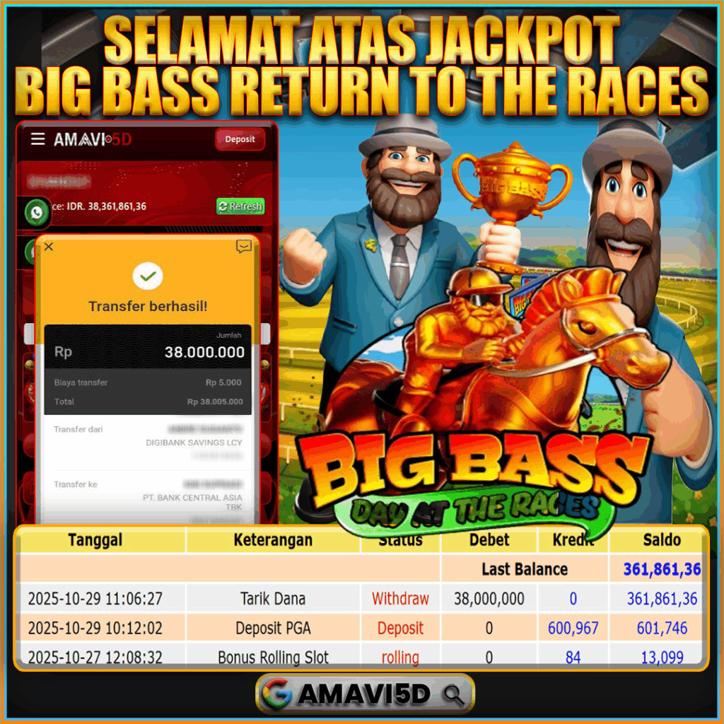 AMAVI5D JACKPOT SLOT BIG BASS RETURN TO THE RACES Rp 38.000.000,- LUNAS, RABU , 29 OKTOBER 2025Selamat kepada User id : RTEI****54 Telah berhasil mendapatkan kemenangan besar pada permainan