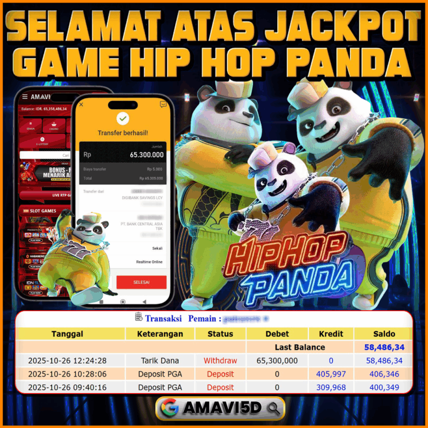 AMAVI5D JACKPOT SLOT GAME HIP HOP PANDA Rp 65.300.000,- LUNAS, MINGGU , 26 OKTOBER 2025Selamat kepada User id : TESE***51 Telah berhasil mendapatkan kemenangan besar pada permainan