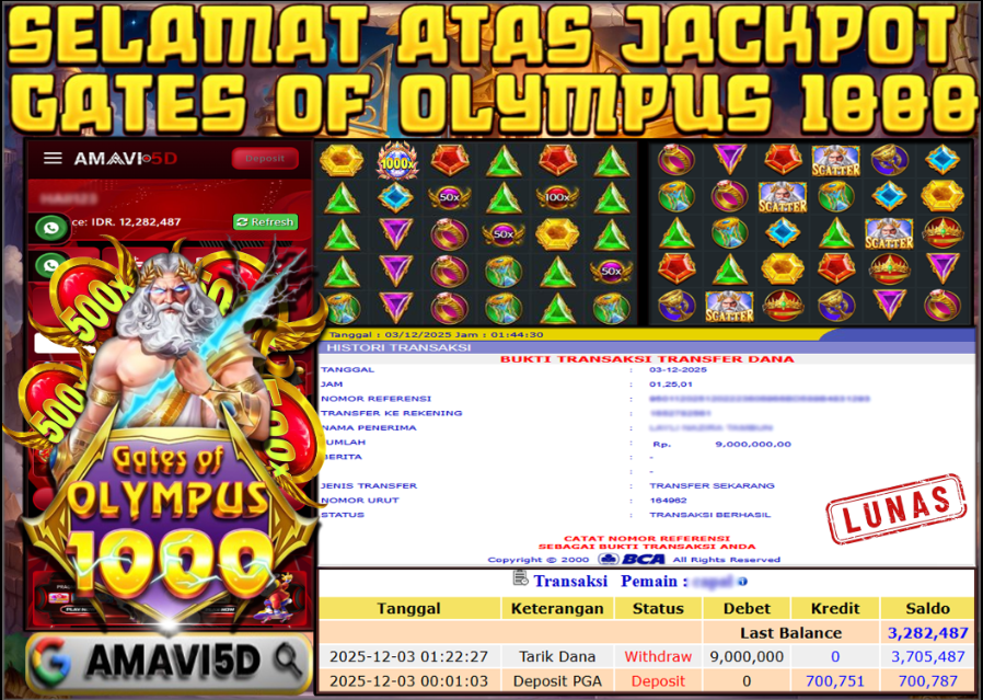 AMAVI5D JACKPOT SLOT GATES OF OLYMPUS 1000 Rp 9.000.000- LUNAS, RABU,03 DESEMBER 2025 Selamat kepada User id :ca*al Telah berhasil mendapatkan kemenangan besar pada permainan