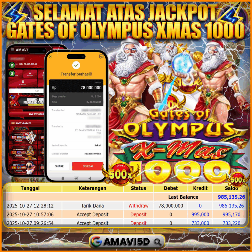 AMAVI5D JACKPOT SLOT GATES OF OLYMPUS XMAS1000 Rp 78.000.000,- LUNAS, SENIN , 27 OKTOBER 2025Selamat kepada User id : RETY***88 Telah berhasil mendapatkan kemenangan besar pada permainan