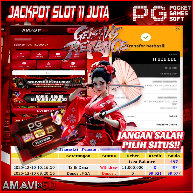 AMAVI5D JACKPOT SLOT GEiSHA’S REVENGE Rp 11.000.000- LUNAS, RABU ,10 DESEMBER 2025 Selamat kepada User id :kenr***25 Telah berhasil mendapatkan kemenangan besar pada permainan