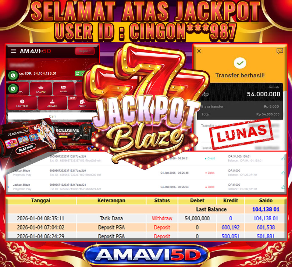 AMAVI5D JACKPOT SLOT JACKPOT BLAZE Rp54,000.000- MINGGU ,04 JANUARY 2026 Selamat kepada User id : CINGON**987 Telah berhasil mendapatkan kemenangan besar pada permainan