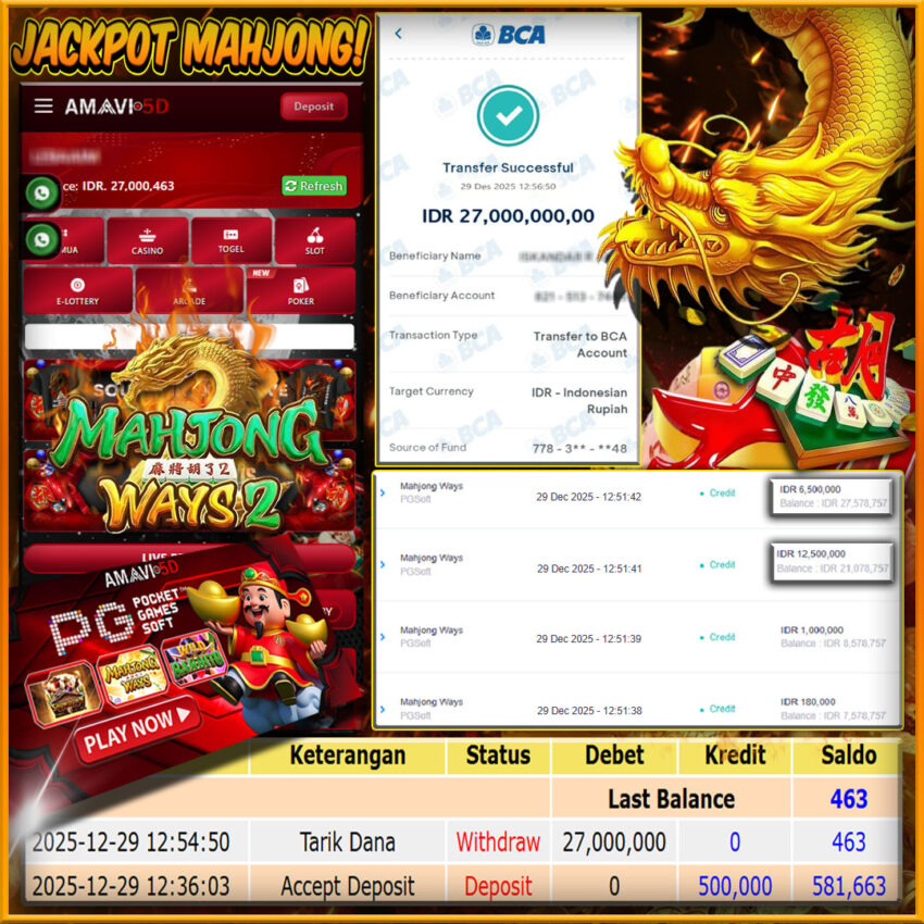 MAHJONG WASY 2 kemenangan Sebesar Rp27.000.000, Setelah mengisi formulir withdraw dengan kurung waktu hanya 5 – 10 menit pihak amavi5d sudah melakukan transfer kepada pemilik User id dan dana sudah dapat di cairkan oleh pemenang. Bukti pembayaran yang kami berikan merupakan bukti pembayaran yang SAH / VALID yang langung di dapatkan melaui tanda transfer transaksi dari Bank yang di tuju. Kami mengucapakan banyak Terima Kasih Kepada pemenang karena sudah mempercayakan kami sebagai Bandar Tepercaya yang membayar semua kemenangan member hingga lunas. Masih ragu dengan amavi5d bos ? Di mana bandar togel online sekarang yang terpercaya seperti amavi5d? Bandar yang mengirimkan kemenangan member tanpa bertele – tele. Jadi…. tidak perlu khwatir pada situs amavi5d karena kemenangan anda berapapun akan dibayarakan hingga lunas kepada pemenang