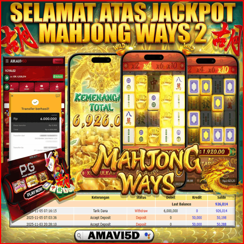 AMAVI5D JACKPOT SLOT MAHJONG WAYS 2 Rp 6.000.000,- LUNAS, RABU, 5 NOVEMBER 2025Selamat kepada User id :ROY***2 telah berhasil mendapatkan kemenangan besar pada permainan