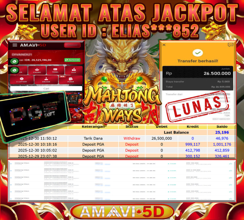 AMAVI5D JACKPOT SLOT MAHJONG WAYS Rp26.500.000- SELASA , ,30 DESEMBER 2025 Selamat kepada User id : ELIAS***852Telah berhasil mendapatkan kemenangan besar pada permainan