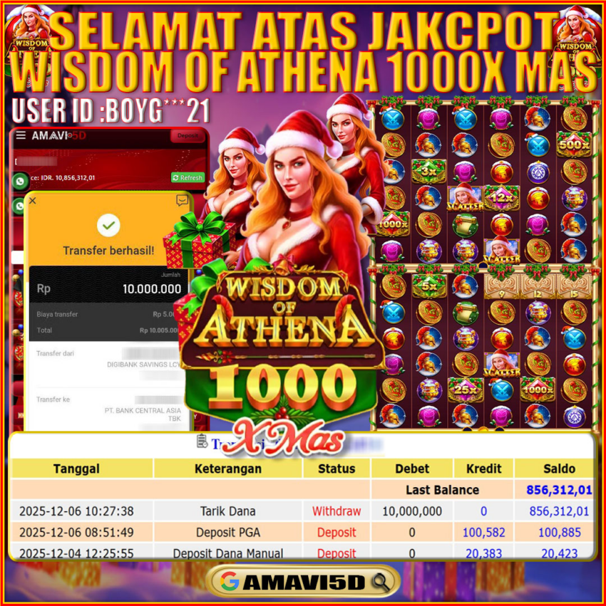 AMAVI5D JACKPOT SLOT WISDOM OF ATHENA1000X MAS Rp 10.000.000- LUNAS, SAPTU ,06 DESEMBER 2025 Selamat kepada User id :BOYG***21 Telah berhasil mendapatkan kemenangan besar pada permainan