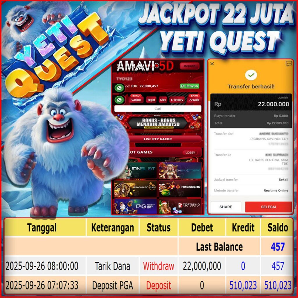 AMAVI5D JACKPOT SLOT YETI QUEST Rp22.000.000,- LUNAS, JUMAT, 26 SEPTEMBER 2025