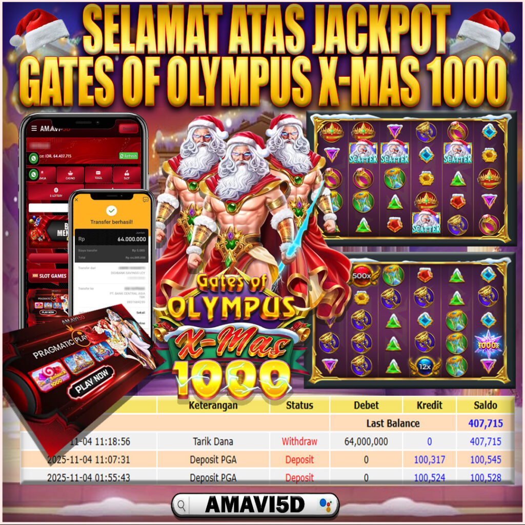 AMAVI5D JACKPOT SLOT Gates Of Olympus Xmas 1000 Rp 64.000.000,- LUNAS, SELASA, 04 NOVEMBER 2025Selamat kepada User id : AR****6454 Telah berhasil mendapatkan kemenangan besar pada permainan