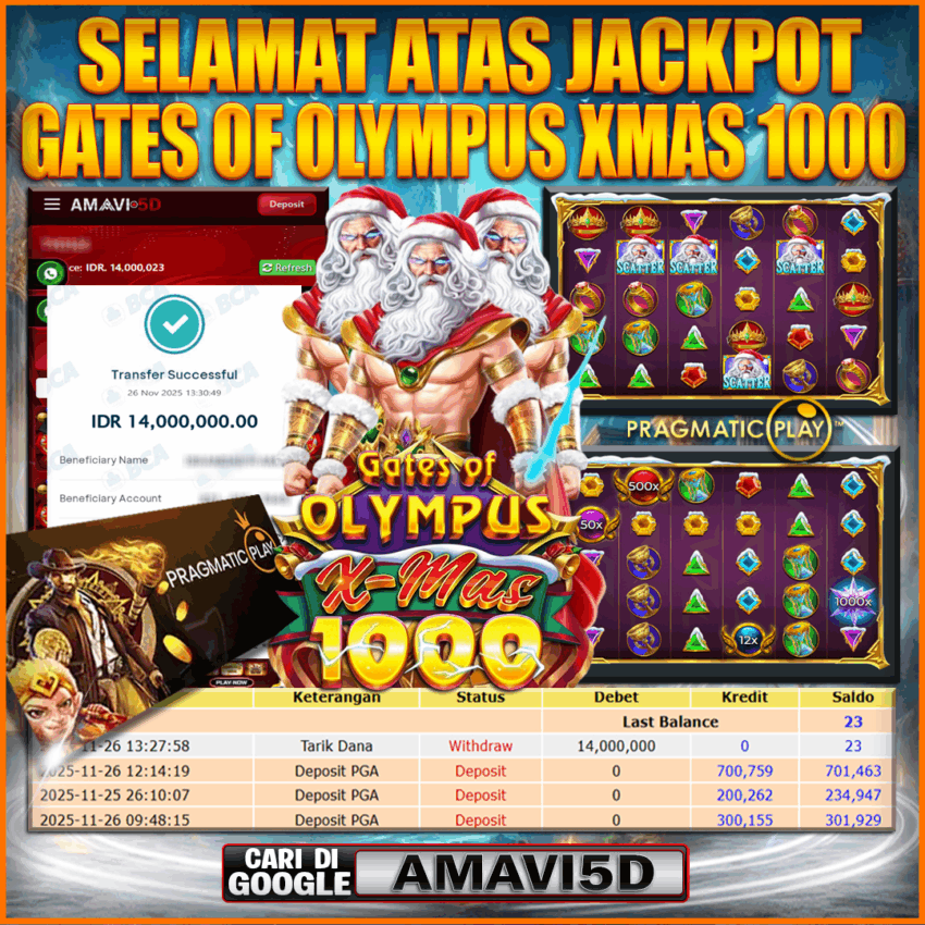 AMAVI5D JACKPOT SLOT GATES OF OLYMPUS XMAS 1000 Rp 14.000.000,– LUNAS, RABU ,26 NOVEMBER 2025 Selamat kepada User id :DEN**12 Telah berhasil mendapatkan kemenangan besar pada permainan