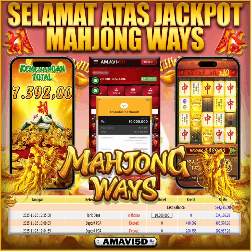 AMAVI5D JACKPOT SLOT MAHJONG WAYS Rp 10.000.000,– LUNAS, RABU ,26 NOVEMBER 2025 Selamat kepada User id : arj***a011 Telah berhasil mendapatkan kemenangan besar pada permainan