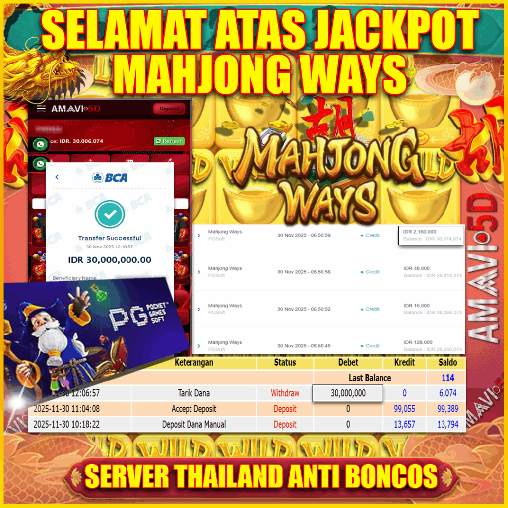 AMAVI5D JACKPOT SLOT MAHJONG WAYS Rp 30.000.000- LUNAS, MINGGU ,30 NOVEMBER 2025 Selamat kepada User id : lia**28Telah berhasil mendapatkan kemenangan besar pada permainan