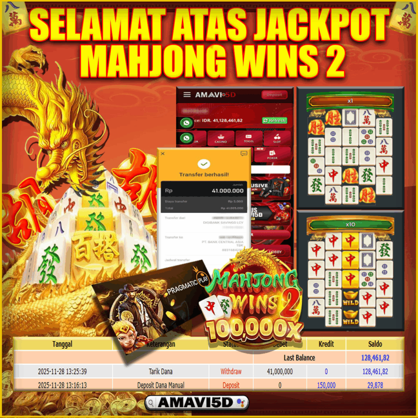 AMAVI5D JACKPOT SLOT MAHJONG WINS 2 Rp 41.000.000,– LUNAS, JUMAT ,28 NOVEMBER 2025 Selamat kepada User id :HAI**K02 Telah berhasil mendapatkan kemenangan besar pada permainan