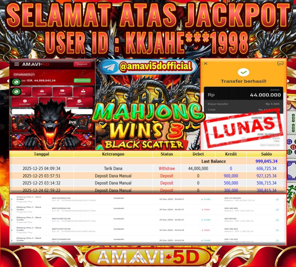 AMAVI5D JACKPOT SLOT MAHJONG WINS 3 BALCK SCATTER Rp44.000.000- KAMIS, RABU ,25 DESEMBER 2025 Selamat kepada User id : KKJAHE***1998 Telah berhasil mendapatkan kemenangan besar pada permainan