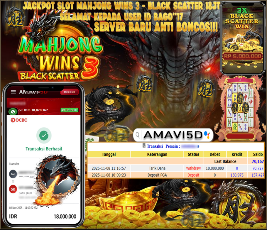 AMAVI5D JACKPOT SLOT MAHJONG WINS 3 – BLACK SCATTER Rp 18.000.000,- LUNAS, SAPTU, 08 NOVEMBER 2025 Selamat kepada User id :BAGO**17 Telah berhasil mendapatkan kemenangan besar pada permainan