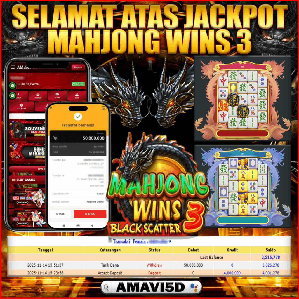 AMAVI5D JACKPOT SLOT MAHJONG WINS 3 BLACK SCATTER Rp 50.000.000,- LUNAS, JUMAT ,14 NOVEMBER 2025 Selamat kepada User id :ANG**123 Telah berhasil mendapatkan kemenangan besar pada permainan