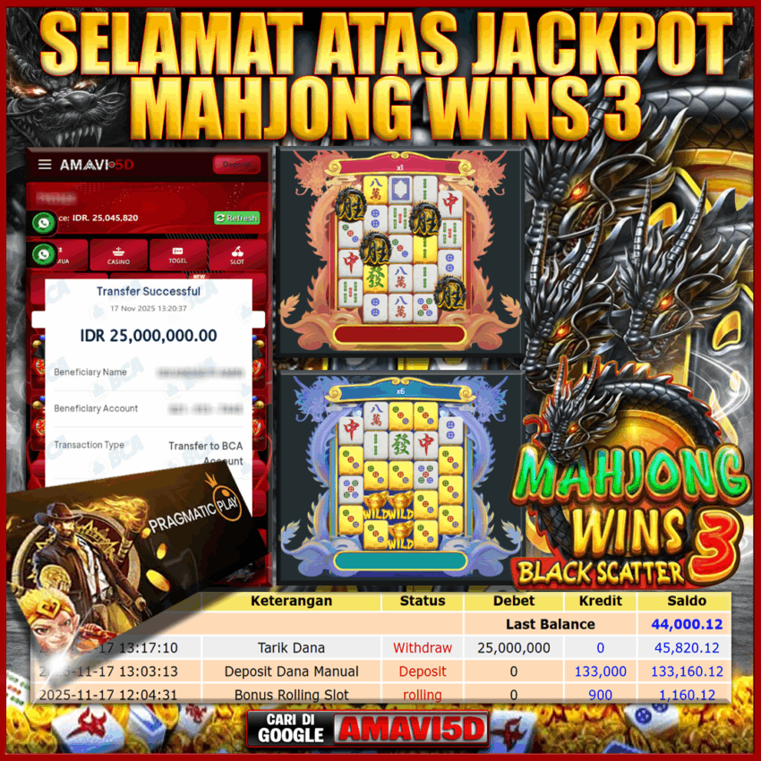 AMAVI5D JACKPOT SLOT MAHJONG WINS 3 Rp 25.000.000,– LUNAS, SENIN ,17 NOVEMBER 2025 Selamat kepada User id :LAM***OR33 Telah berhasil mendapatkan kemenangan besar pada permainan