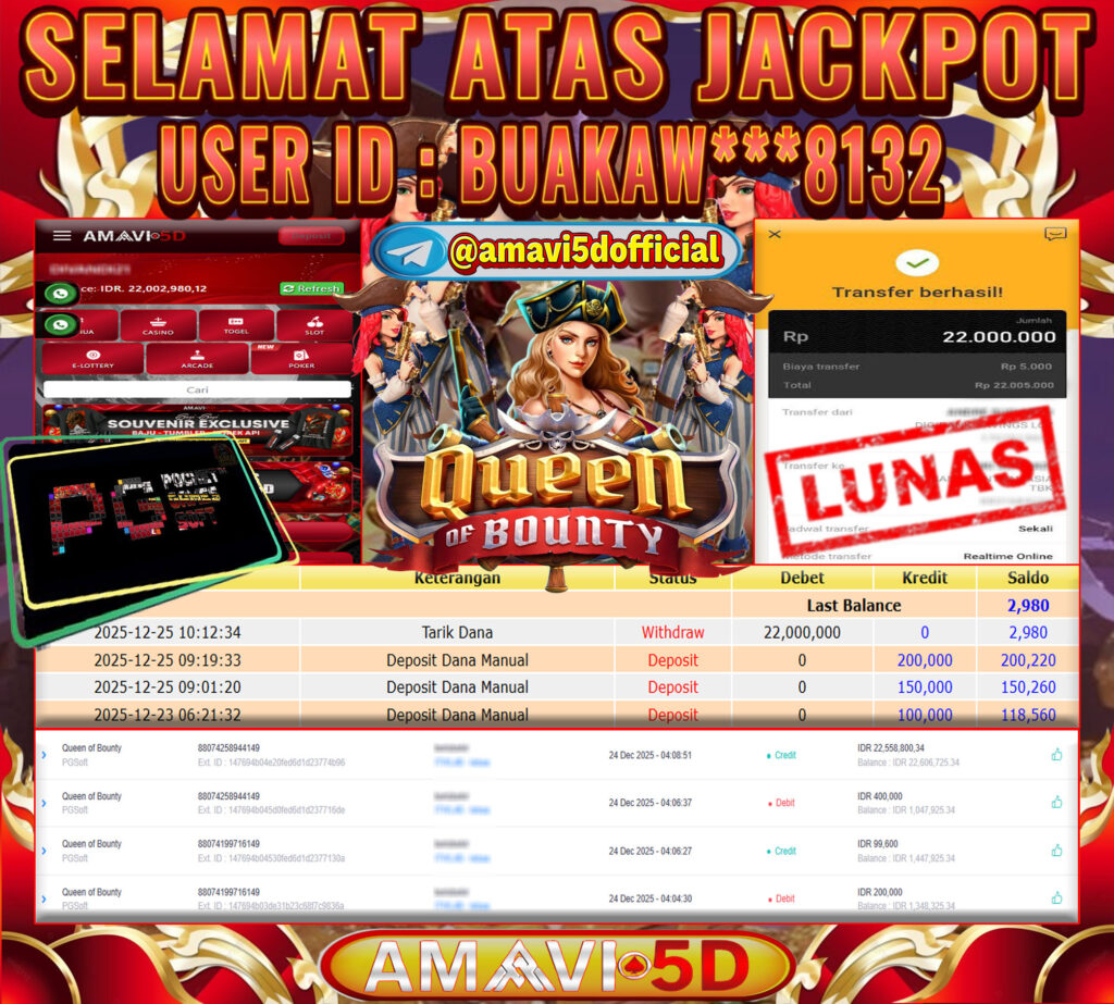 AMAVI5D JACKPOT SLOT Queen of Bounty Rp22.000.000- KAMIS, ,25 DESEMBER 2025 Selamat kepada User id : BUAKAW***8132 Telah berhasil mendapatkan kemenangan besar pada permainan