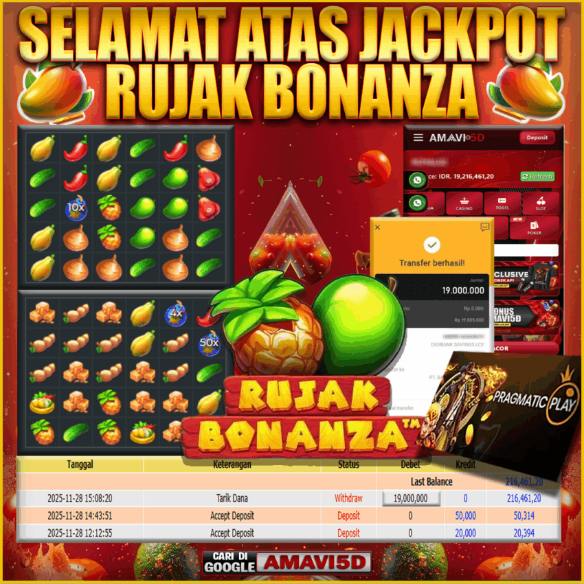 AMAVI5D JACKPOT SLOT RUJAK BONANZA Rp 19.000.000,– LUNAS, JUMAT ,28 NOVEMBER 2025 Selamat kepada User id :bad**890 Telah berhasil mendapatkan kemenangan besar pada permainan