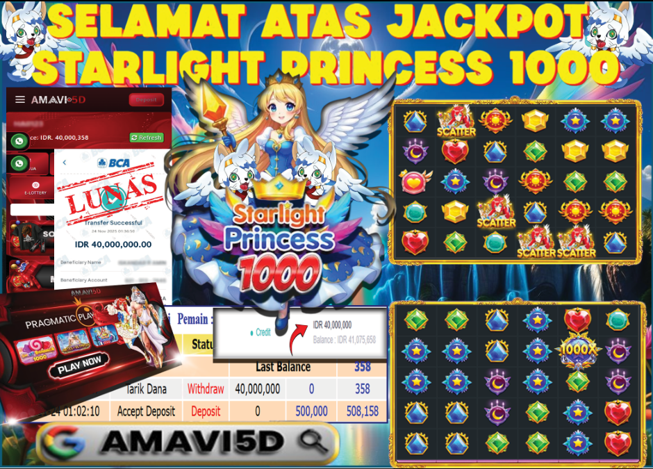 AMAVI5D STARLIGHT PRINCESS 1000 Rp 40.000.000,– LUNAS,SENIN ,24 NOVEMBER 2025 Selamat kepada User id :bun**888 Telah berhasil mendapatkan kemenangan besar pada permainan
