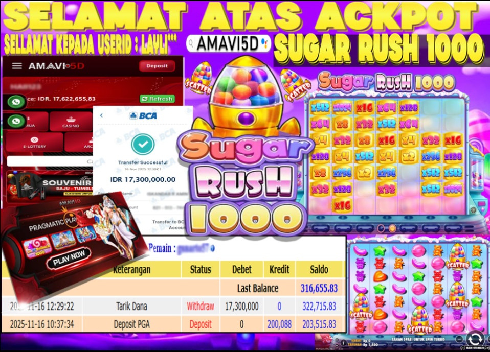 AMAVI5D JACKPOT SLOT SUGAR RUSH 1000 Rp 17.300.000,-LUNAS,MINGGU,16 NOVEMBER 2025 Selamat kepada User id : LAILY*** Telah berhasil mendapatkan kemenangan besar pada permainan
