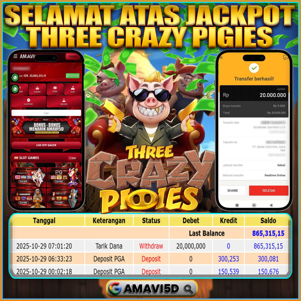 AMAVI5D JACKPOT SLOT THREE CRAZY PIGIES Rp 20.000.000,- LUNAS, RABU , 29 OKTOBER 2025Selamat kepada User id : KEN****64 Telah berhasil mendapatkan kemenangan besar pada permainan