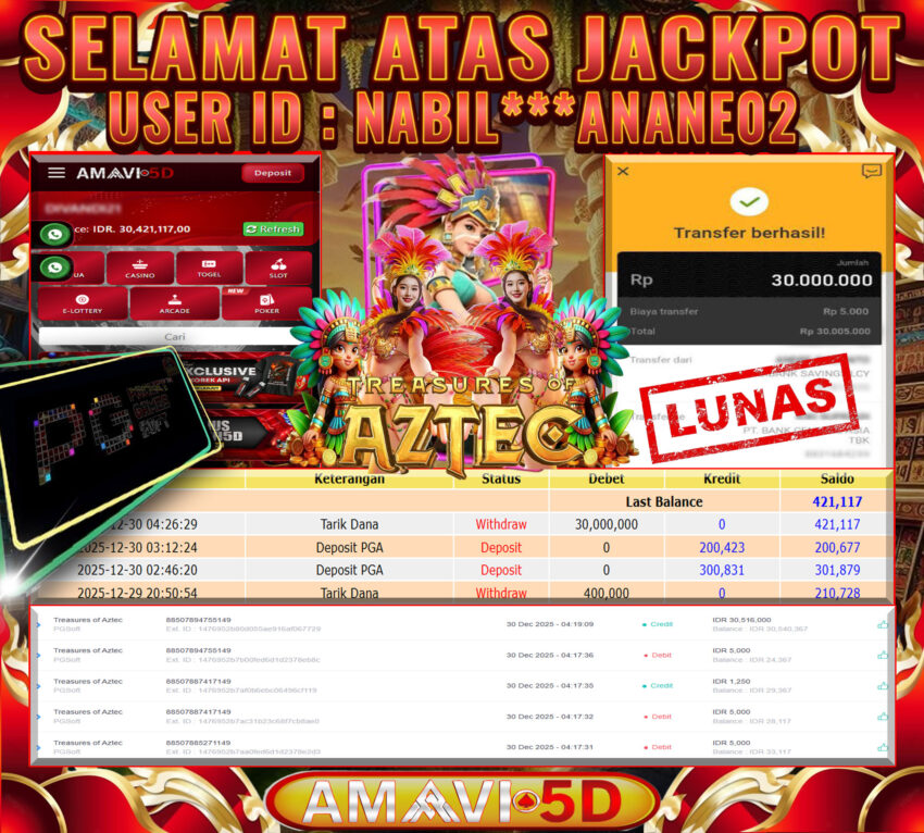 AMAVI5D JACKPOT SLOT Treasures of Aztec Rp30.000.000- SELASA , ,30 DESEMBER 2025 Selamat kepada User id : NABIL***ANAE02 Telah berhasil mendapatkan kemenangan besar pada permainan