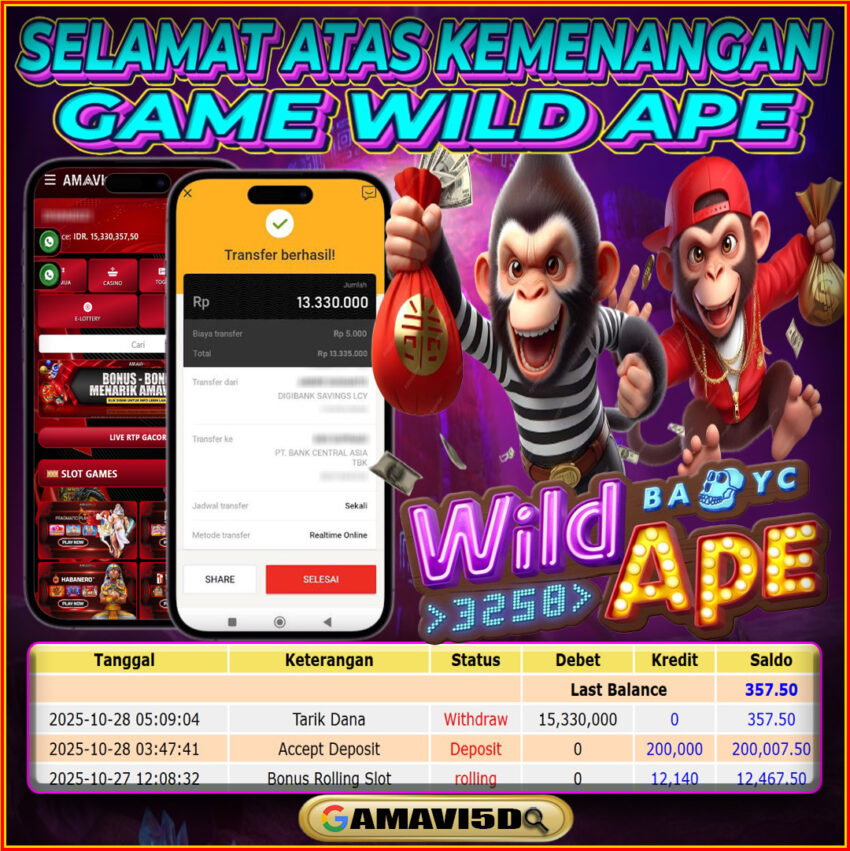 AMAVI5D JACKPOT SLOT WILD APE Rp 13.330.000,- LUNAS, SELASA , 28 OKTOBER 2025Selamat kepada User id : KAM****848 Telah berhasil mendapatkan kemenangan besar pada permainan