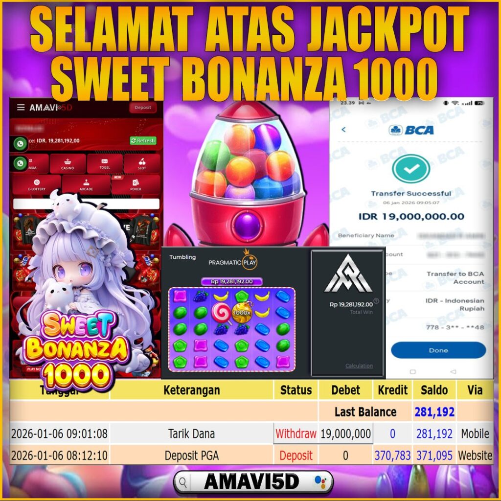 AMAVI5D JACKPOT SLOT SWEET BONANZA 10000 Rp19,000.000- SELASA ,06 JANUARY 2026 Selamat kepada User id : ayu***1112 Telah berhasil mendapatkan kemenangan besar pada permainan