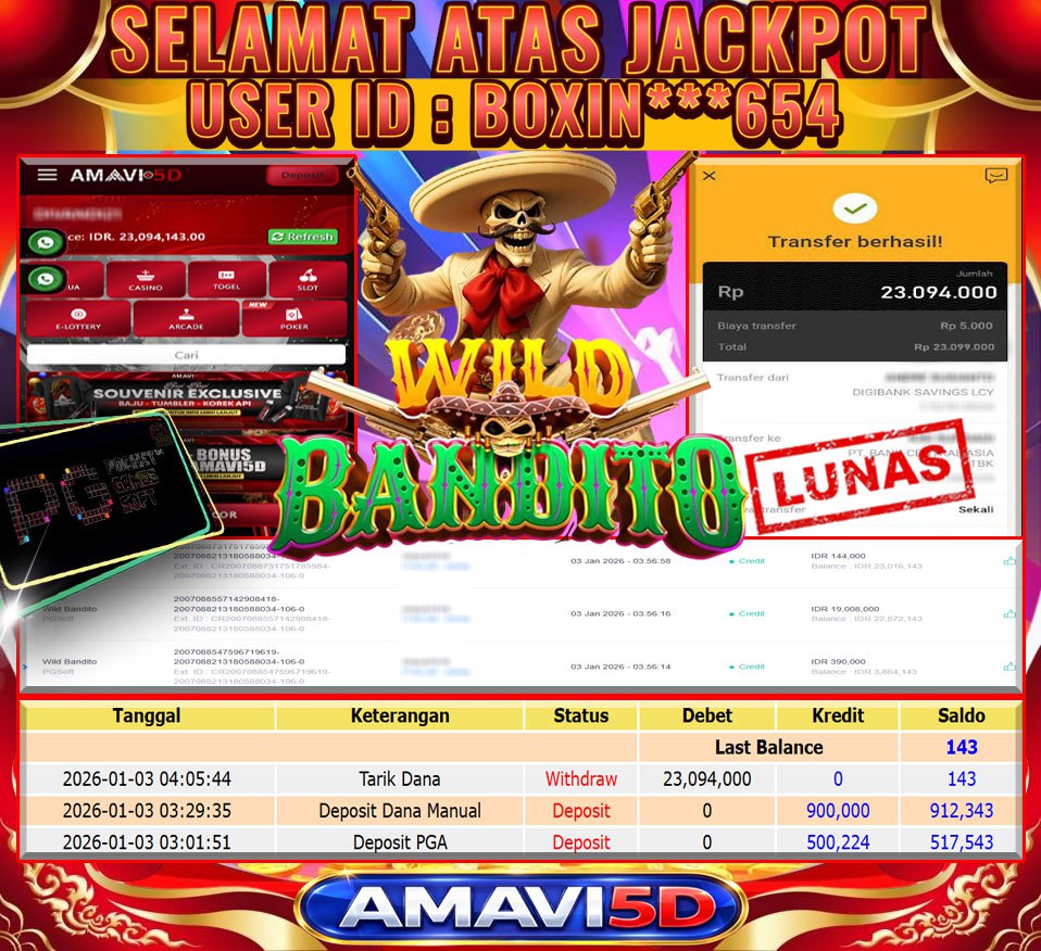 AMAVI5D JACKPOT SLOT WILD BANDITO Rp23,094.000- SABTU ,03 JANUARY 2026 Selamat kepada User id :BOXIN***654 Telah berhasil mendapatkan kemenangan besar pada permainan